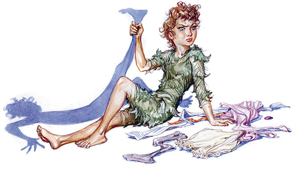 «Наверное, нужно было её погладить», – спохватилась Венди, но Питер, как и все мальчишки, равнодушный к своему внешнему виду, уже вовсю скакал по комнате и, позабыв поблагодарить Венди, твёрдо уверенный, что всё сделал сам, восторженно приговаривал: