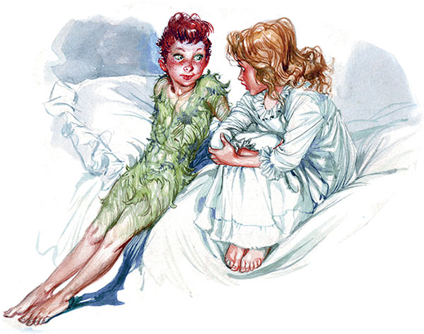 Венди была удивлена, но ответ мальчика так её заинтриговал, что, словно светская дама, слегка дотронувшись до своей ночной рубашки, жестом пригласила его сесть поближе.