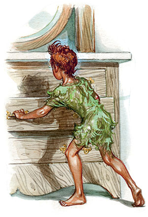 Через мгновение после появления феи звёздочки подули в окно, оно распахнулось, и в комнату спрыгнул Питер. Часть пути он нёс фею в руке, и на ней осталась волшебная пыльца. Увидев, что дети спят, Питер тихо позвал: