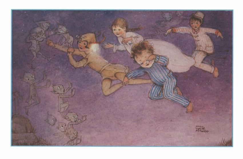 Конечно, Питер откровенно над ними издевался: никто не сможет летать, пока на него не посыпали волшебную пыльцу. К счастью, как мы уже заметили, на одной руке мальчика сохранилась эта пыльца, и, сдув её на детей, он велел: