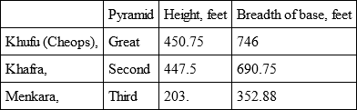 We speak now of the three largest – there are six others in this group, and twenty-seven more throughout the Nile valley. They are perfectly adjusted to points of the compass – north, south, east and west. Modern investigators have found in the construction, proportions and position of the “Great Pyramid” especially, many things which point to a marvellous knowledge of science on the part of their builders. If the half they say is true of them, there are a vast number of lost arts to discredit modern genius. Some go so far as to trace in their measurements and construction, not only prophecy of the coming of Christ, but chart of the events which have signalized the world’s history and are yet to make it memorable. They base their reasoning on the fact that there was no architectural model for them and no books extant to teach the science requisite for their construction, that their height and bases bear certain proportions to each other, and to the diameter of a great circle, that they are on the line of a true meridian, that certain openings point to certain stars, and so on till ingenuity is exhausted.