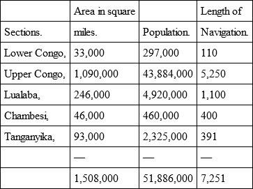 So sanguine was Stanley of the commercial situation on the Congo and in tropical Africa that he ventured to tell the practical merchantmen of Manchester how they could triple the commerce of the entire west coast of Africa by building two sections of narrow gauge railway, each 52 and 95 miles long, connected by steamboat navigation, or a continuous railway of 235 miles long, around Livingstone Falls, and thereby opening the Upper Congo to steamboats. Such a step would insure the active coöperation of more than a million of native traders who are waiting to be told what they can furnish out of their inexhaustible treasures, besides those they have already set a value on, as iron, oil ground-nuts, gum, rubber, orchilla, camwood, myrrh, frankincense, furs, skins, feathers, copper, fibres, beeswax, nutmegs, ginger, etc.