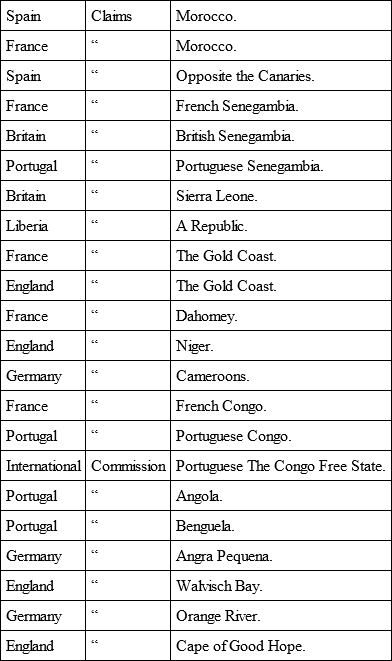 Some of these claims are old, some new; some are confirmed, some vapid; some are direct political claims, some indirect, as where a protectorate only exists, and the real power is vested in a trading company, as in the British West African Company, with powers to occupy and develop the Niger country.