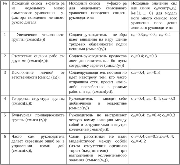 Исходными данными является словесная модель и 13 исходных значений сил влияния ckj=corr (yj, zk),kÎ {1,…,6}, jÎ {1,…,6} (18 индикаторов наличия знаний). Словесная модель может быть сформулирована по-разному. Мозаика {ckj} из элементов будущей матрицы задается экспертом в соответствии со смыслами и силами парной связи ckj=corr (yj, zk) нижеперечисленных 12 смыслв. Словесная модель имеет зависимые по смыслам показатели. сформулированные ниже 6 неизмеряемых 6 показателей приняли приводимые ниже 6 смысли после осмысления 2-х вариантов реализации когнитивной модели ложного соавторства без когнитивного диссонанса конструируе мых фразИсходной информацией для модели являются смысли 6 y-факторов, характеризующих соцлен- руководите ля, которые способствуют появлению эффекта Рингельмана и 6 z-факторов, характеризующих сотрудников группы (Таблица 5.1).