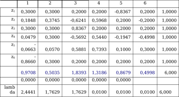 В решаемой ниже Оптимизационной Задаче: (I66,I66) => (C66, Λ66) целевая функция λ1+…+λn равна 6 при изменяемых значениях 6*6+6 элементов 2-х матриц C66, Λ66, а ограничения: CтC¹I66, C66Cт66=I66, Λ66=diag (λ1,…λn),tr (Λ66) =λ1+…+λn=n, λ1≥…≥λn≥0.