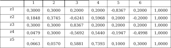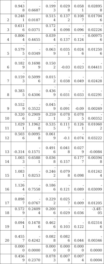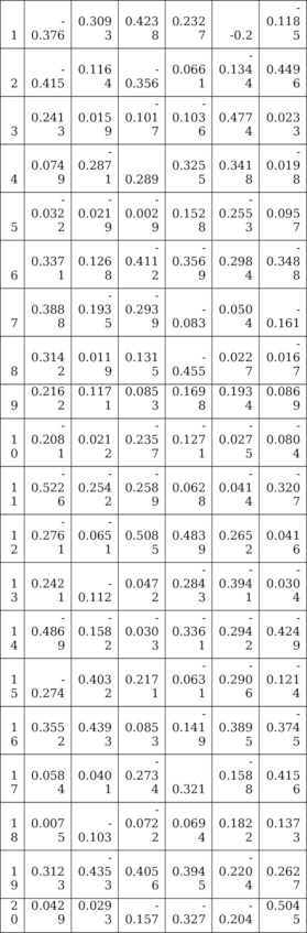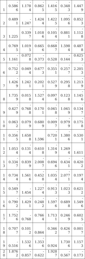 Только 6-ое смсловое уравнение смысл (y6) =смысл (z1) *0.4231Åсмысл (z2) * (-0.2435) Åсмысл (z3) *0.4000+смысл (z4) *0.1826Åсмысл (z5) *0.2300Åсмысл (z6) *0.2600 с семантическими переменными является имеющим практически смысл решением Когнитивной Моделью Ситуации с Ложным Соавторством. Найдем модельные значения y- и z—отклонений, являющихся числовыми переменными математической модели, соответствующей своему смысловому уравнению смысл (yi6) =смысл (zi1) *0.4231Åсмысл (zi2) * (-0.2435) Åсмысл (zi3) *0.4000Åсмысл (zi4) * 0.1826Åсмысл (zi5) *0.2300 Åсмысл (zi6) *0.2600 со своими семантическими 7 переменными смысл (zi1),…,смысл (zi6), смысл (yi6), i=1,…,m. Смысли z—отклонений заданы в исходных данных решаемой задачи, смысл y-отклонений смысл (yi6) мы конструировали выше. Математическая модель состоит из матриц Um6 и Ym6 таких, что (1/m) UTm6Um6=I66,Ym6=Um6Λ1/2nn, Zm6=Ym6Cт66. При этом верны равенства Λ66= (1/m) YTm6Ym6, C66= (1/m) ZTm6Ym6, где матрица C66 по построению (после решения решения Оптимизационной задачи 2) является матрицей псевдособственных векторов: CCт=Inn, CтC¹Inn. Матрица Y (t) m6, t=1,…,µ, обеспечивает случайность будущих значений y- и z—отклонений из матриц Y (t) m6. Z (t) m6. В матрице Ym6 элементы j—го столбца y1j,y2j,…,ymj (j-ая y-переменная, j=1,…,6) имеют среднее арифметическое, равное нулю: (1/m) (y1j+y2j+ …+ymj) =0, и дисперсию равную λj: (1/m) (y21j+y22j+ …+y2mj) =λj, при этом сумма дисперсий равна 6: λ1+…+λ6=6. Матрицы Ym6,Zm6=Ym6CT66,, приведены в Таблицах 5.7 и 5.8. Из 6 вновь выявленных модельных смысловых уравнений, образующих систему, практическую ценность имеет только смысловое уравнение вида смысл (yi6) =смысл (zi1) *0.4231Åсмысл (zi2) * (-0.2435) Å смысл (zi3) *0.4000Åсмысл (zi4) *0.1826Åсмысл (zi5) *0.2300Åсмысл (zi6) *0.2600. Остальные уравнения из системы проанализируем в отдельном исследовании. В нашем уравнении y-фактор y6 влияет на 6 модельные «веса» 0.4231, (-0.2435), 0.4000, 0.1826, 0.2300,0.2600. они отражают их относительные силы воздействия на y-фактор y6 (при 16 исходных индикаторах).