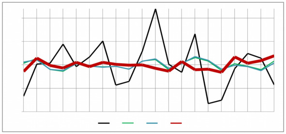 Рисунок 5.1. Взаимная динамика 3-х z -изменчивостей z2, z4, z5, влияющих на изменчивость на y —изменчивость фактора y4 со смыслом «соцлен-руководитель оценивает работы других, олирается на женщин, не склонных к социальной