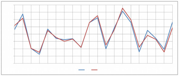 Точки на Рисунке 5.1 показывают взаимные динамики «скачки-падения» точек переменных (z2,z4,z5,y4). Эта визуализация позволяет узнать синхронноcть отклонений переменной z4 (смысл (z4) =«Гендерная принадлежность группы») при отклонении значения переменной z5 от 0 (смысл (z5) = «Культурная принадлежность группы»). График динамик пары z-отклонений (z4,z5) выделен отдельно (Рисунок 5.2). Мы обнаружили синхронность динамик этой пары отклонений от точки (0,0), теперь можно считать реальной познающую способность модели. На Рисунке 5.2 видим: во всех 20 точках наблюдается синхронность «скачков-падени» точек (zi4,zi5),i=1,…,20. Это означает «Гендерная (смысл (z4))» и «Культурная принадлежности группы (смысл (z5))» изменяются одинаково и оба фактора, из-за наличия заметных значений (сильной связи обеих переменных z4,z5 с переменной y4) с44=0,5440; с54=0,7393. Здесь мы видим работу модельных индикатора с44=0,5440; с54=0,7393, а не работу исходного значения индикаторов с14=0,2. Модель исправляет неправильно назначенные экспертом значения индикаторов. Свои замены значений индикаторов модель «обосновывает» как смысловыми (с семантическими переменными), так и алгебраическими (с числовыми переменными) равенствами. Обе переменные влияют на y —изменчивость фактора y4 соцлен-руководителя. Так выглядит краткий визуальный портрет соцлен-руководителя типа «соцлен-руководитель предоставляет дополнительные бонусы сотруднику зара нее».