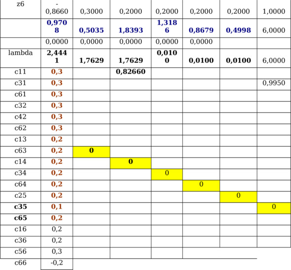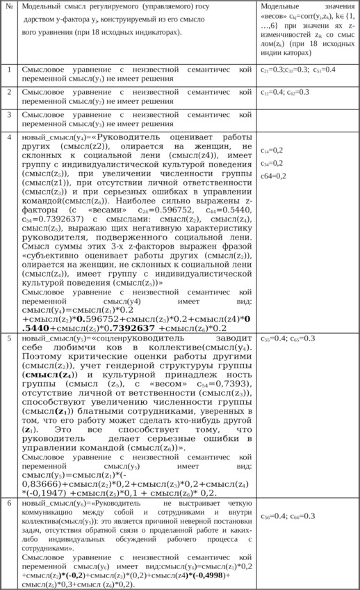 Результаты азработки 6 многосмысловых уравнений с известными и неизвестными семантическими переменными приведено в Таблице 5.3. Среди 6 вновь выявленных модельных смыслов 6 y-факторов, в которых модельные веса z-факторов отражают их относительные силы воздействия на один y-фактор (при 16 исходных индикаторах) найден только 1 смысл одного y-фактора y6.