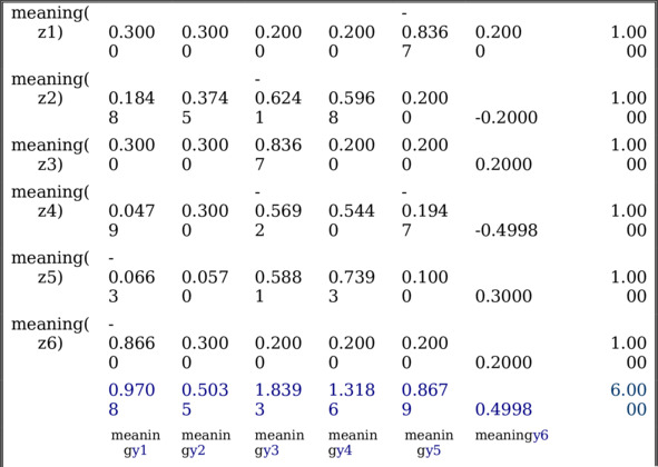 Для семантической переменной смысл (y6) с исходным смыслом смысл (y6) =«стимулирование активности научой работы (в т. ч. „публикации в Скопусе“) студентов, магистрантов» нами получено смысловое уравнение с модельными параметрами. Они и смысли изменчивостей дали, как показано выше, уравнение с известными смыслами и слчайными значениями zk проявлений смыслов смысл (zk), k=1,…,6, k-ых z-переменных zk. Уравнение состоит из слагаемых вида: zik*сkj, i=1,…,m; j=1,….,6, i – номер момента времени измерения, j – номер z-переменной.