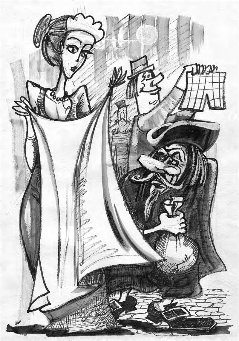– А ткань, вы посмотрите, какая ткань, – не унимался Карлик, – такой тонкой ткани вы еще не видели. А теперь вопрос – сколько стоит эта юбка? – и он достал из сундука чудную кружевную юбку.