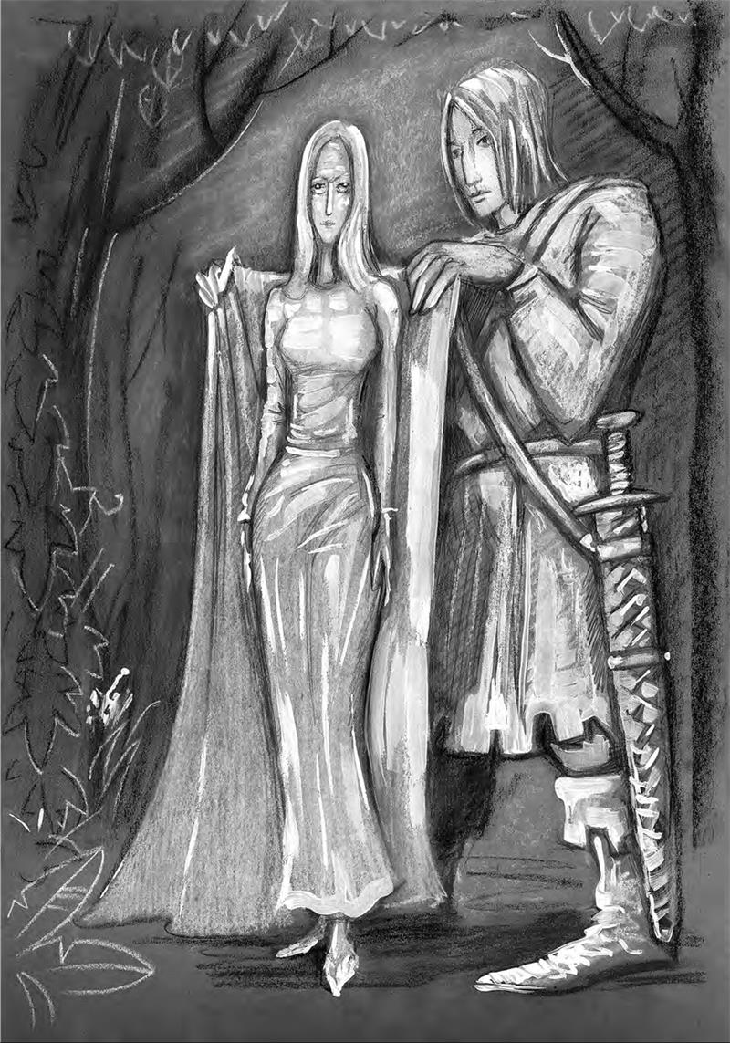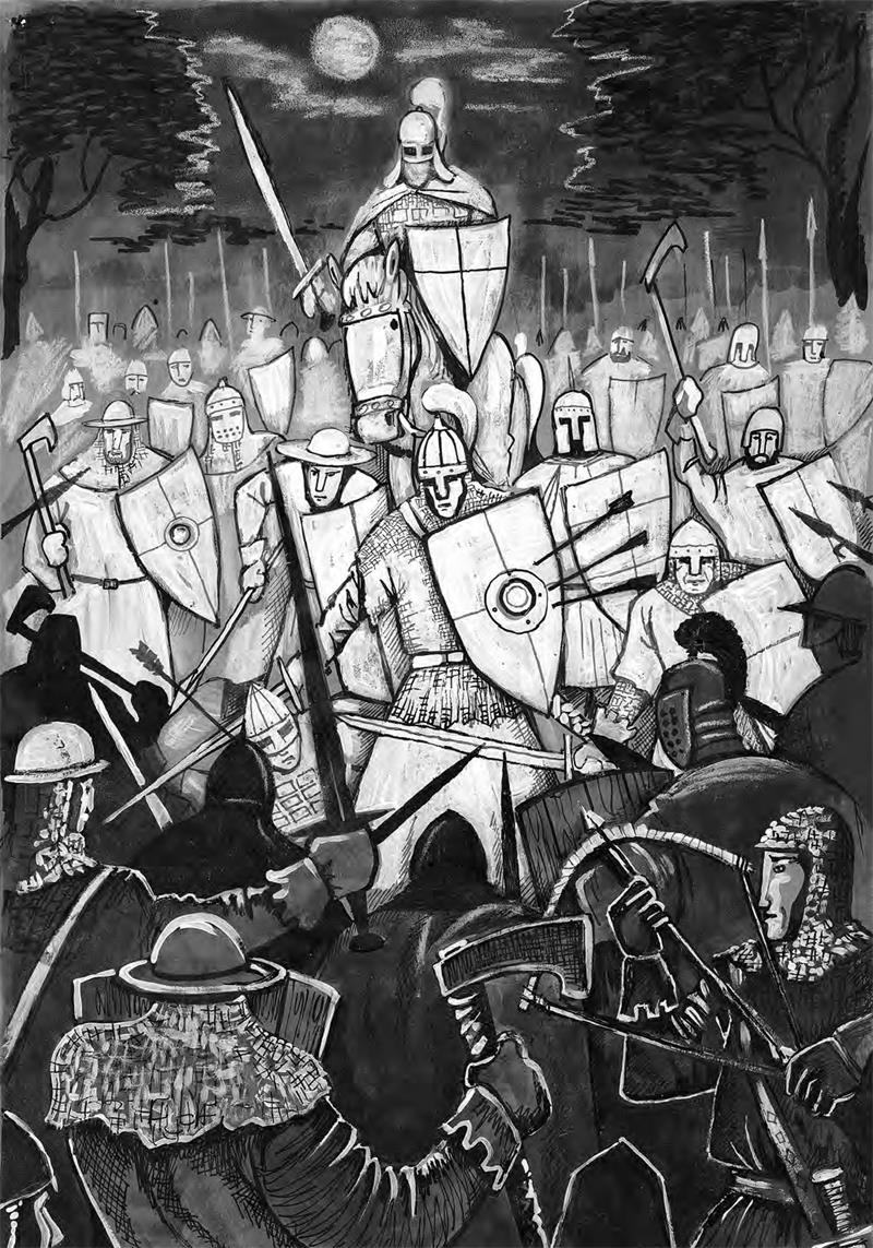 Только прозвучали эти слова, как из тумана возникла большая тень воина. Он достал рог и протрубил боевой знак. Из дымки на черных рыцарей облаками полетели белые воины, и завязалось сражение.