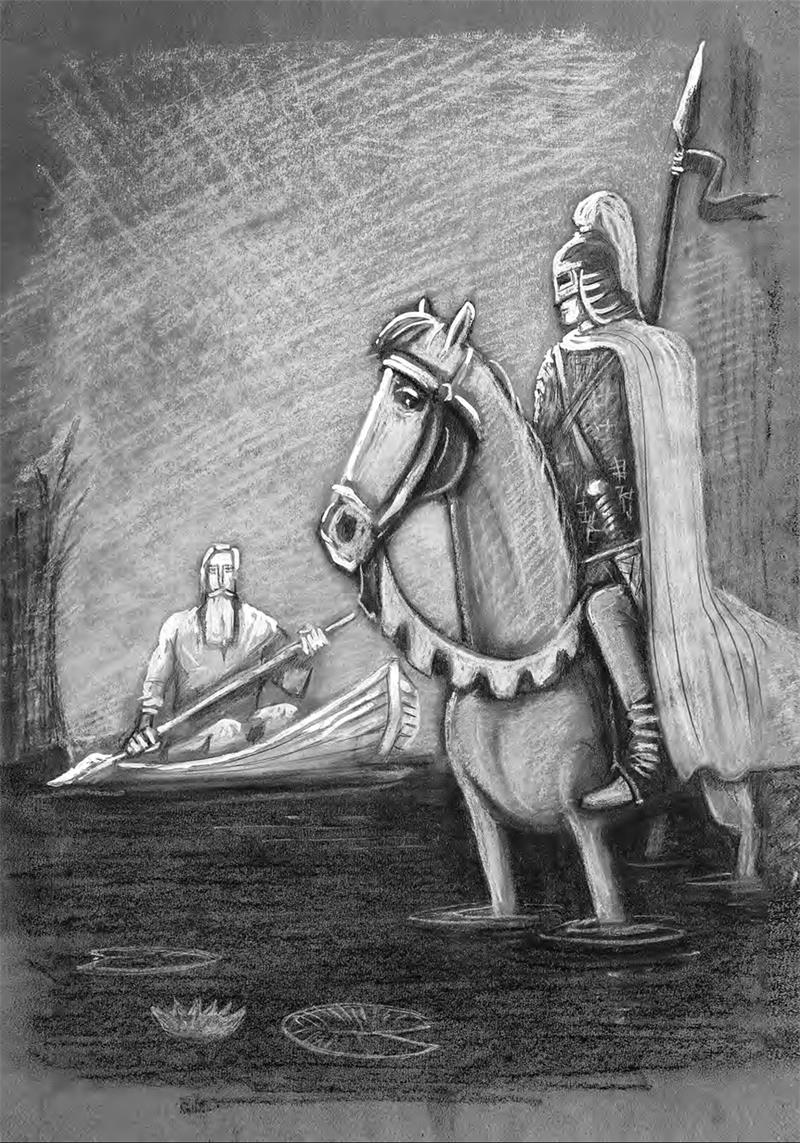 Воины поднялись и белой лавиной пошли на удивленных врагов. Нервы у черных не выдержали, с криками их войско побежало вниз с горы, теряя оружие и товарищей. Лавриус преследовал врагов, но не заметил, как низину быстро заполнил туман. И тут воин понял, что оторвался от своих, потерял врагов и блуждает в дымке. Откуда взялся туман? Вдруг прямо под копытами коня рыцарь увидел воды Черного озера. Как же он мог так заблудиться? Из тумана на темной глади воды выплыла лодка. Ею управлял красивый не старый мужчина с окладистой бородой, одетый во все белое. Белыми были его борода, брови и волосы.