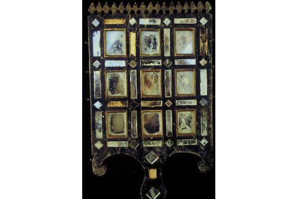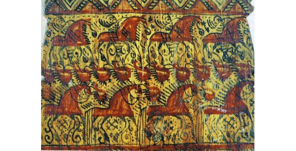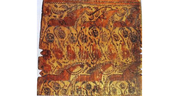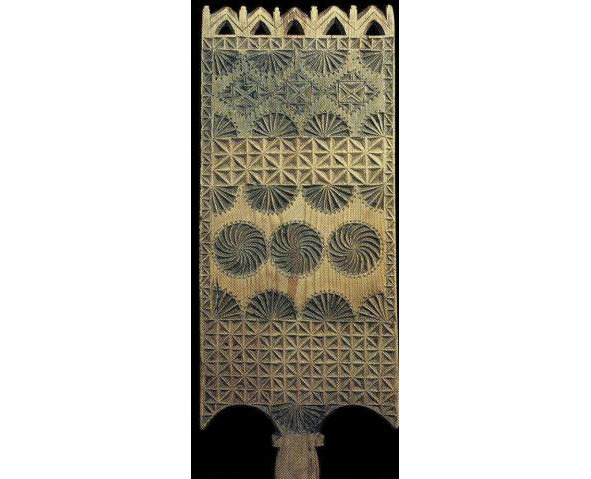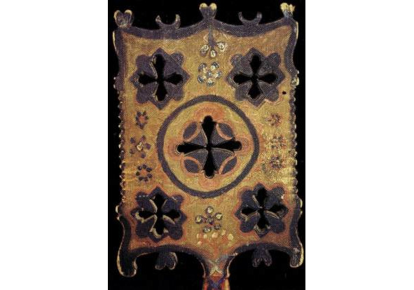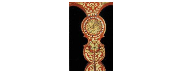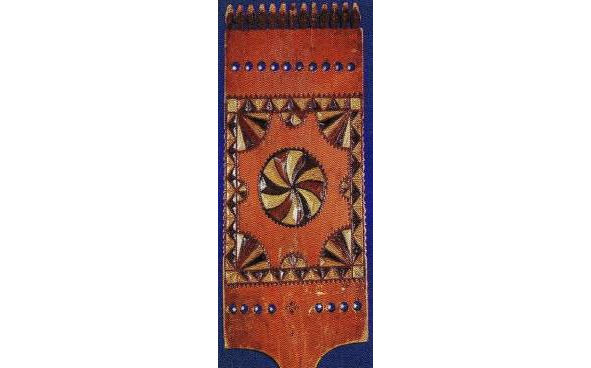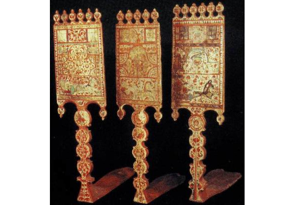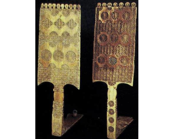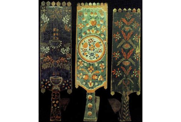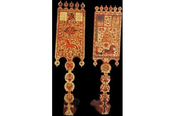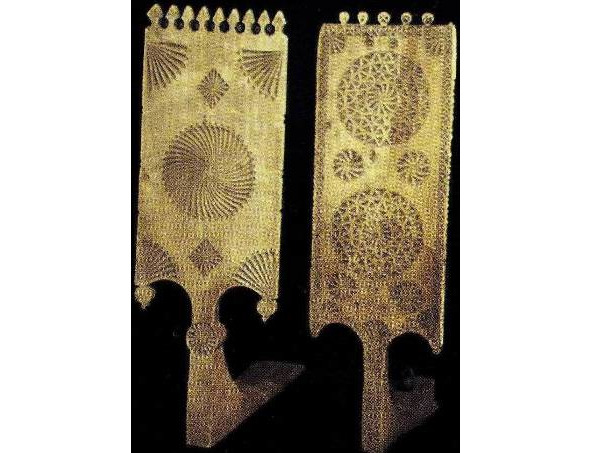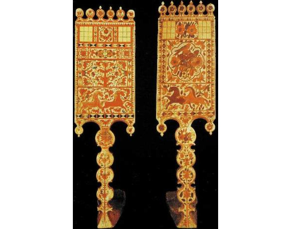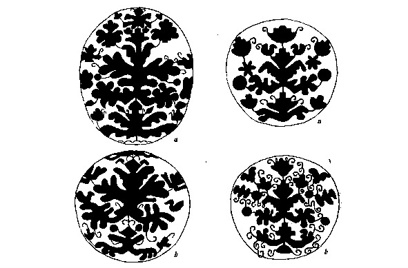 Рис. 1. а, b – золотная вышивка на четвертях тарногских повойников. Вологодская губ. XIX в. (Вологодский областной краеведческий музей, инв. №18660 и 20927). Рис. 2. a, b – золотная вышивка на четвертях тарногских повойников. Вологодская губерния. XIX в. (Вологодский областной краеведческий музей, инв. №27078/5).