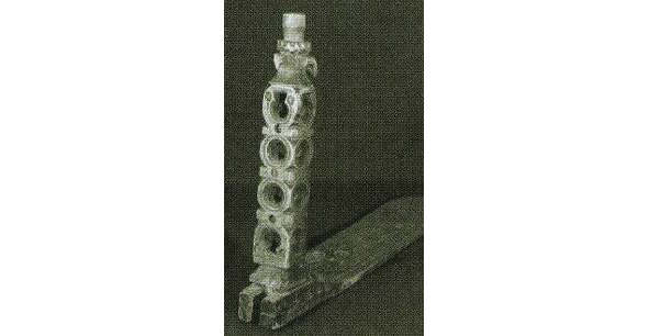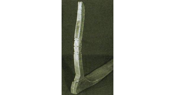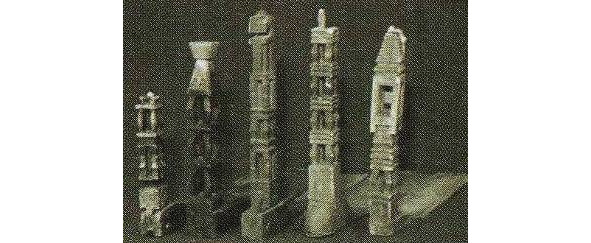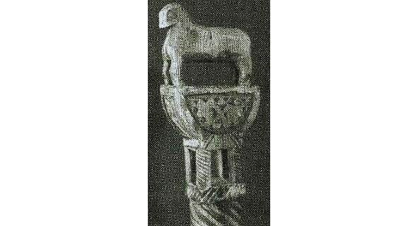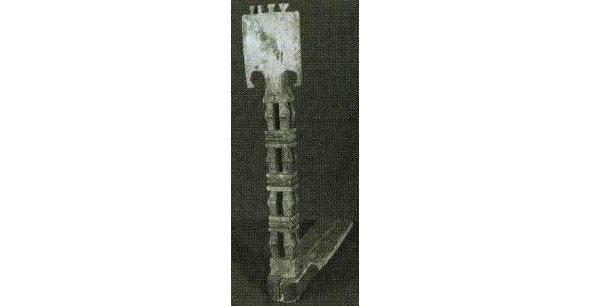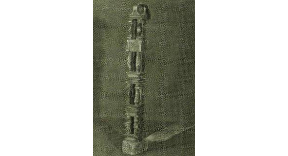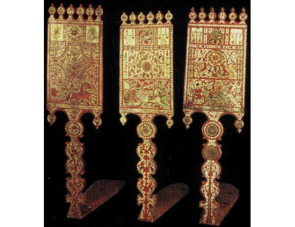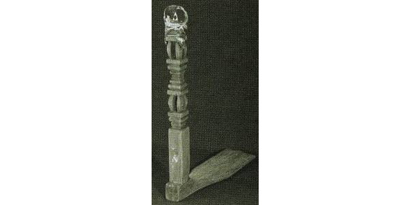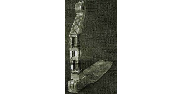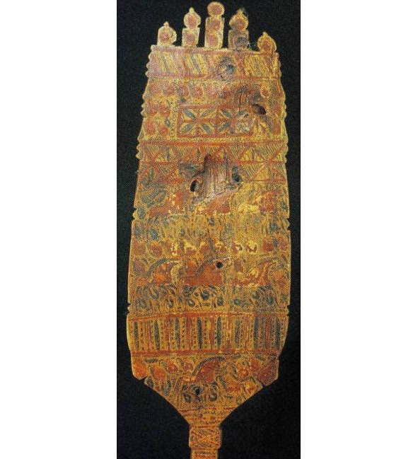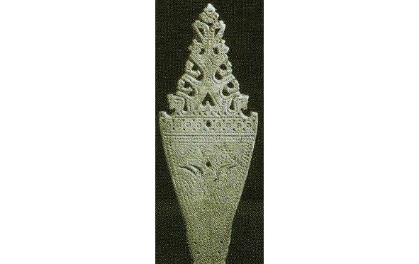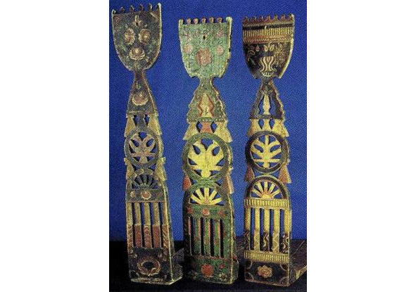 Если в типе А представлена наиболее развернутая древняя схема, где слившиеся изображения коней, птиц, собакоголовых существ и змей как бы образуют фигуру древней языческой богини, то в навершии типа В композиция суше, схематичнее, головки змей поднимаются вверх, трехлистник, венчавший предыдущее навершие, приближается по очертаниям к короне; наконец, тип с демонстрирует нам смену древнего языческого змеиного комплекса изображением двуглавого царского орла, увенчанного короной.