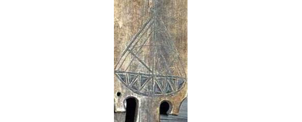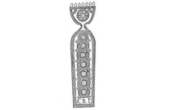 На тыльной стороне ножки все несколько иначе. Здесь также присутствует «божественный» головной убор в виде двух лучистых квадратов, но венчает он не шести, а тринадцатилучевую розетку- «голову». Кроме того, над ней и на уровне плеч (где с внешней стороны ножки помещены две розетки – груди) находятся волнистые линии – знаки воды. Под нижним знаком воды помещено 28 вертикальных насечек. И наконец, донце прялки отмечено специфической надписью (о которых мы говорили ранее) и резным, рельефным изображением змеи, относящейся также к кругу образов, связанных с мужским воспроизводящим началом.