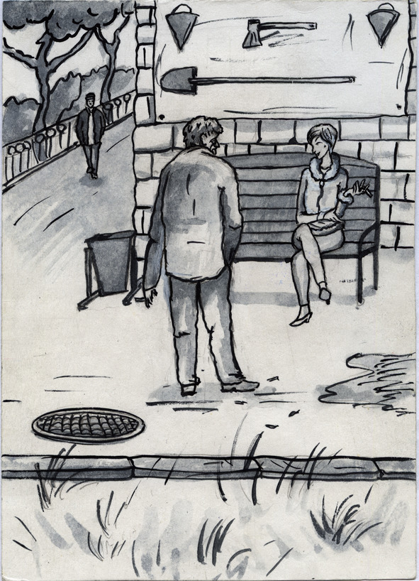 Фрол не стал сопротивляться, с независимым видом сплюнул через плечо и проследовал за девушкой. К стене здания был прикреплен пожарный щит с лопатой и топориками, рядом кто-то поставил бронзовую урну и скамеечку. Блондинка присела и мечтательно начала пускать дым колечками. Петька остался стоять.