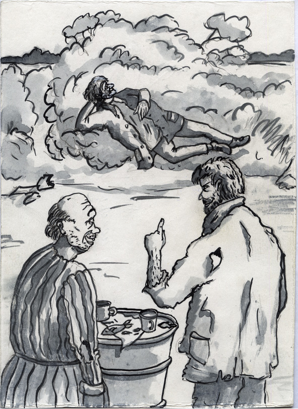 Довольный Васька, видимо, тоже уже поправивший здоровье, держал следующую выпивку возле лица Фрола.