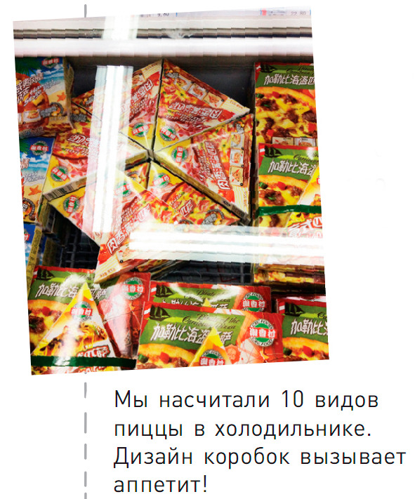Почувствовали себя героями старого анекдота про двух коммивояжеров из конкурирующих обувных фабрик, которых директора отправили в Африку изучать потенциальный рынок сбыта. Проведя несколько дней на жарком континенте, один из них заявил, что рынок обуви там полностью отсутствует, так как все жители ходят босиком. А второй с энтузиазмом доказывал, что Африка – это огромный перспективный рынок, потому что здесь обуви нет ни у кого! Вот и я весь день думал, неужели китайцы не любят пиццу? На самом деле – любят, да еще как! В качестве подтверждения их гастрономических пристрастий прикрепляю фотографию красивых упаковок замороженной пиццы на прилавках одного из их супермаркетов.