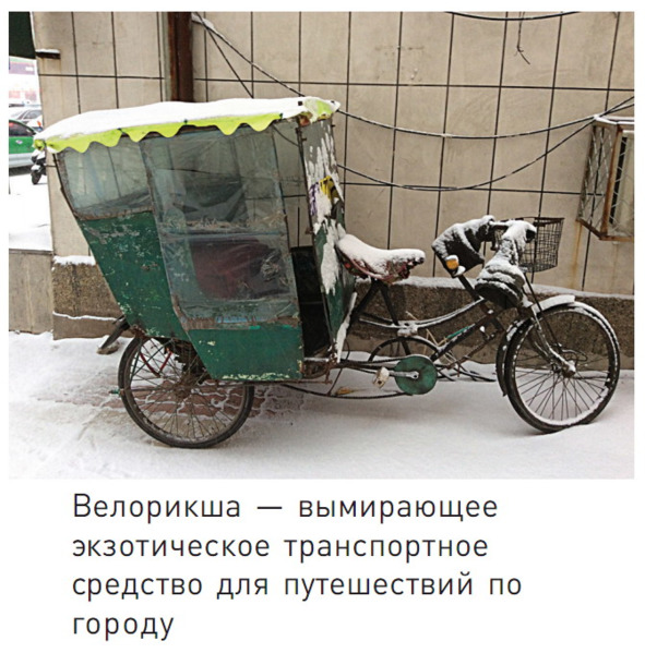 Недалеко от гостиницы обнаружил представителя вымирающего вида городского пассажирского транспорта. Говорят, еще несколько лет назад велорикша был популярным средством перемещения по Хуньчуню.