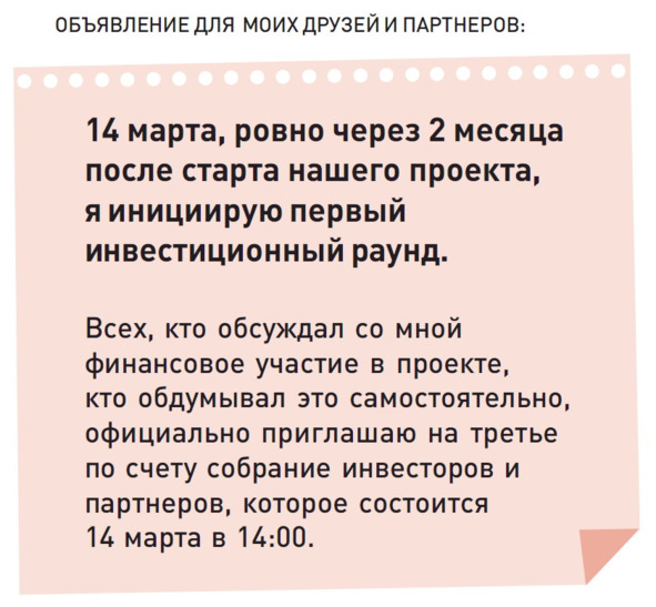 Всех, кто обсуждал со мной финансовое участие в проекте, кто обдумывал это самостоятельно, официально приглашаю на третье по счету собрание инвесторов и партнеров, которое состоится 14 марта в 14:00.