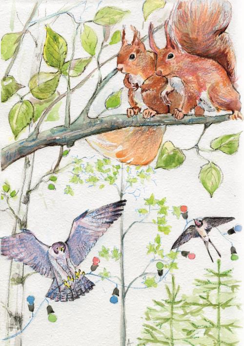 Юркая ласточка тут же спикировала с высоты и подхватила своими лапками падающее украшение. Она изо всех сил махала крылышками, но тяжёлая цепь тянула маленькую птичку вниз, и гирлянда могла бы упасть и разбиться. На помощь ласточке бросились сразу несколько сильных птиц, но всех опередил сапсан, самая быстрая птица на земле. Мгновение – и вот уже белки надёжно привязывают гирлянду к вершине дерева.