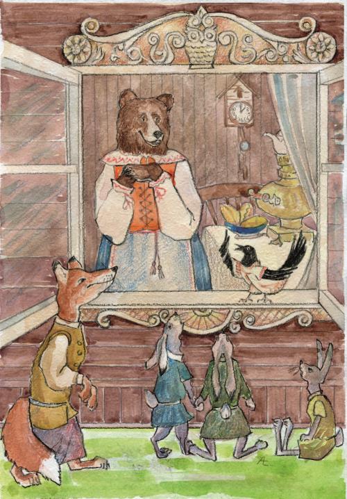 Ещё издали молодой медведь увидел, что вся его семья вышла из дома в ожидании гостей. Михайло Иванович и Мария Михайловна стояли спокойно, как и подобает взрослым медведям. Малышня же, как всегда, устроила настоящий тарарам. Две девочки-близняшки, Маша и Даша, прыгали друг через друга, им пытался подражать совсем ещё маленький Макс, но у него ничего не получалось. Расшумелись они все вместе не на шутку.