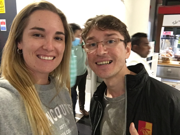 Я много ей вопросов задавал, и она с удовольствием на них отвечала, чувствуя себя экспертом по Йоханнесбургу. Мы с ней фотографировались на память. И с этой девочкой (кажется, Кэролайн) тоже сфотографировались Долго я с ними общался, и тут ещё какая-то белая женщина подошла, затем семья с детьми, ещё и еще подходили люди. Все мне что-то советовали, я был в эпицентре, как российский турист в недрах Африки.