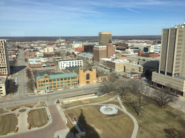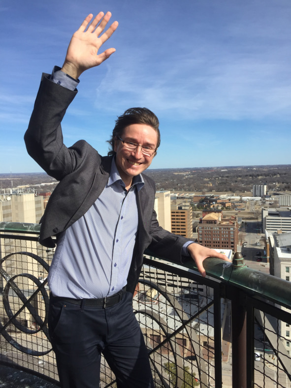 На завершающем этапе надо было преодолеть желтую навесную узкую металлическую лестницу, устремленную в самую вершину купола. Идти по ней было не так страшно, но я беспокоился за Лэна. Все-таки человеку 72 года, а подниматься надо было очень высоко. Тем более, что Лэн довольно полноват и небольшого роста. Но мы поднялись, и уже на самой последней винтовой лестнице очень хорошо слышали порывы ветра снаружи. Выйдя на узкий балкон вокруг башенки, завершающей купол, мы увидели перед собой восхитительную панораму солнечной Топики. Ветер был сильный, но не холодный. Зато развивал пиджак и волосы. Так что на фотографии я получился на себя не похожим.