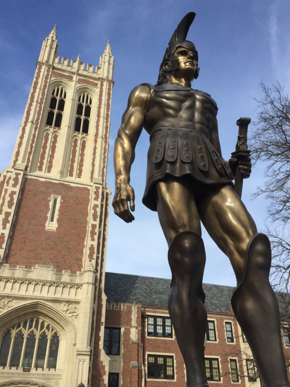 Рассчитывая иметь еще какое-то время в запасе, я пошел в сторону хай скул. И не прогадал. Хоть в здание я попасть не пытался, снаружи оно было очень масштабным. Высокая башня в центре фасада, скульптура индейца перед входом и скамейки от выпускников 1960-х годов. Все это окружение просто дышало историей.