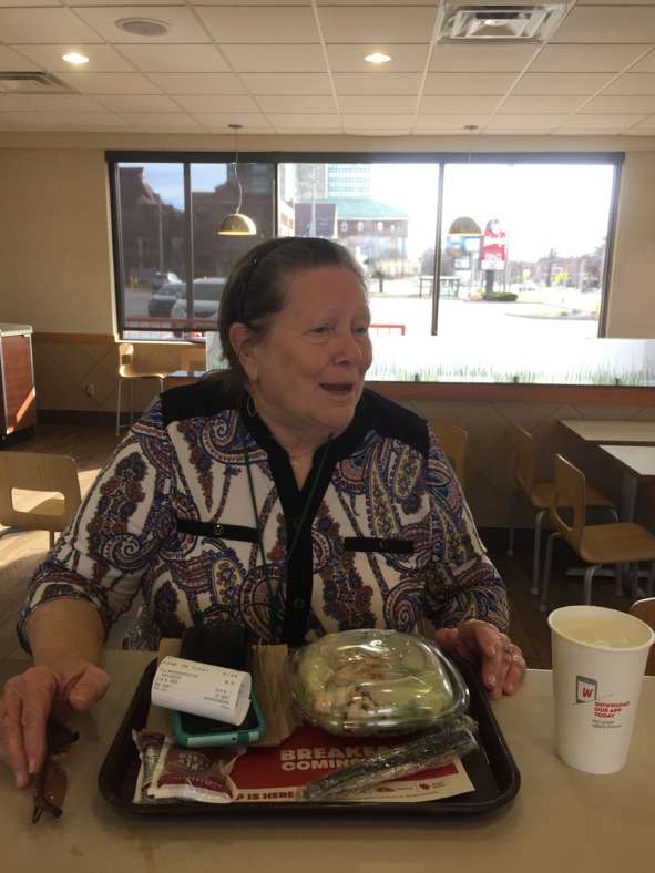 Она также рассказала, что ее сын работает в университете в каком-то из центральных штатах – и работает как раз в христианской университетской группе (христиан министри груп). Разговор длился больше часа. И в конце, когда она наконец доела свой салат, мы были готовы ехать. Она спросила меня, обнимабелен ли я? Я конечно подтвердил это, и мы обнялись, и сделали с ней селфи.