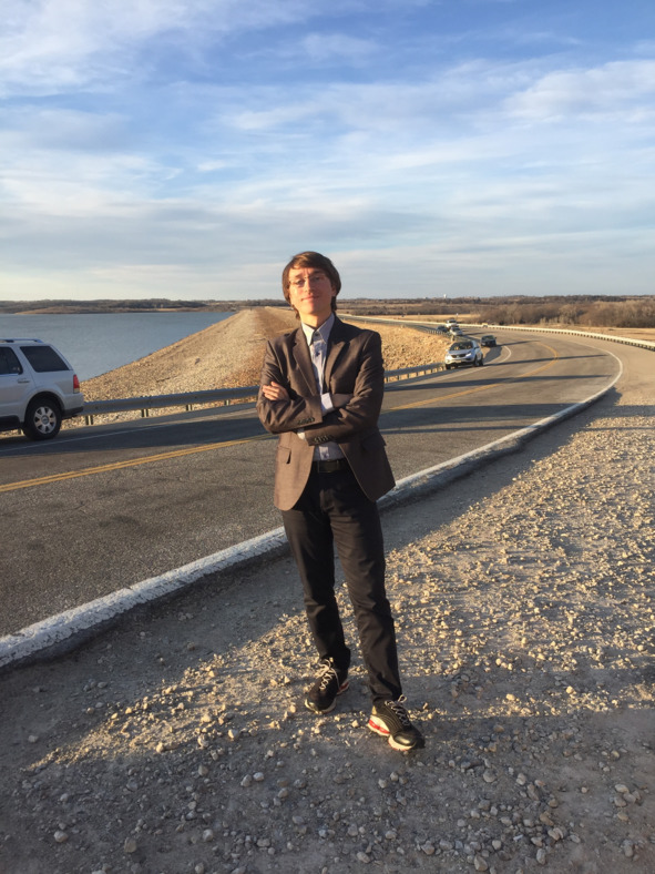 Через 2 остановки мы приехали в Канзас Юнион, но большой экран в холле развернут не был. Закрыт был и книжный магазин, и мы решили пойти в Ореад, поскольку там есть и экран с последними новостями, и магазин сувенирный там открыт. Пока мы шли по дороге к Ореад, Клаудия сфотографировала меня. От яркого солнца я пару раз чихнул. Я хотел сделать селфи вместе, но так и забыл про это. Она была в голубой куртке с оранжевым рюкзаком, а я нес свою темно-синюю куртку в руках, оставаясь в черной футболе с надписью Brave. Это была настоящая репетиция лета.