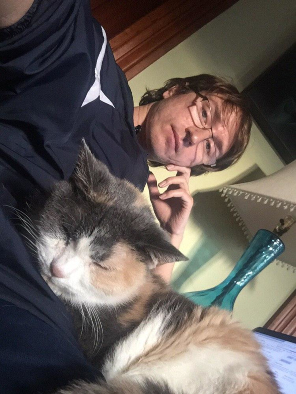 Тут пришла кошка Элиза. Я позвал ее к себе, и к моему удивлению, она прыгнула, и села ко мне на колени. Она очень долго крутилась на месте, и никак не могла занять удобную позу. Ну и понятно, ведь ей уже 20 лет. Мутные глаза слезятся, на носу черная точка. Но хозяйка Джослин очень любит ее, а я обещал о ней позаботиться, и чувствовал на себе ответственность. Попытался сделать несколько фотографий – селфи меня с кошкой, но все было что-то не то – слизящиеся глаза, точка на носу. И только когда она уснула, получилось хорошее селфи, и я отправил ее Джослин.
