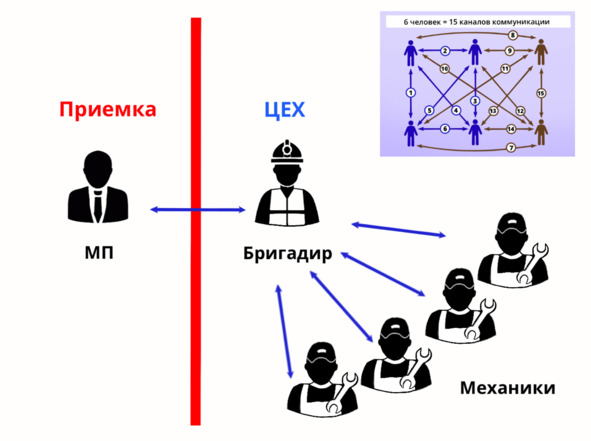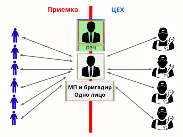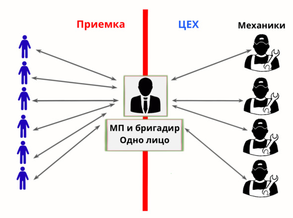 Снова повторюсь: в своей компании я выбрал свой подход, это когда МП является и руководителем, и отцом-командиром, и одновременно напрямую несёт ответственность перед клиентом и руководит подчинёнными ему механиками. И тогда получается, что работает командный принцип, где управление и взаимодействие внутри команды происходит в оптимальном составе 4—5 человек. И мы видим, что такая команда способна в оперативном пространстве держать 4—5 клиентов, и это как раз то критическое количество участников, когда МП способен один всё удержать в голове. Исключили мы бригадира лишь только потому, что исходили из своего практического опыта.