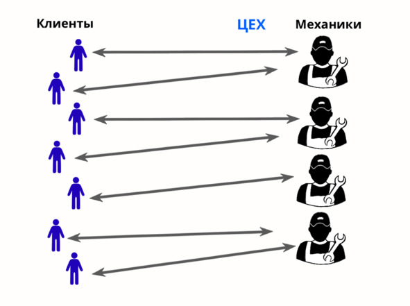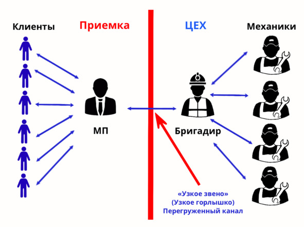 Поэтому, возвращаясь к воспоминаниям про несовременную организационную схему, которую реализовали в крупном дилерском центре, когда мастеров-приёмщиков подчинили одному начальнику, механиков и бригадиров замкнули и подчинили другому начальнику, а менеджеры запчастей и склад подчинялись третьему начальнику, плюс, все механики были поделены на ТО-шников, «агрегатчикив» и диагностов, понимаем – только исходя из проблемы их коммуникации, эта схема организации была обречена на провал. Что и подтвердилось позже.