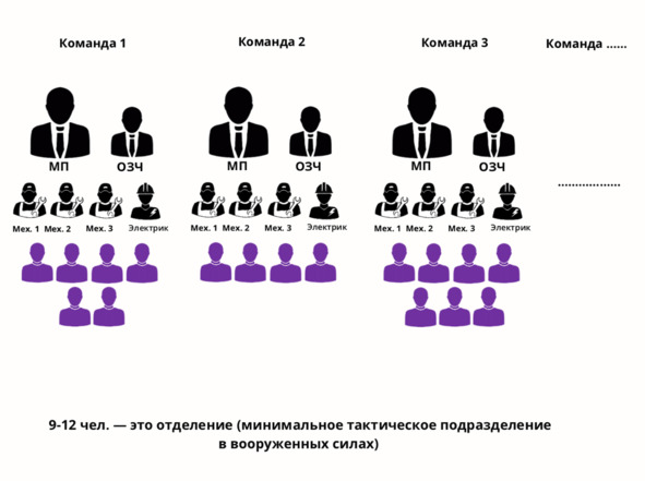 И поэтому, возвращаясь к теории малых команд, я хотел бы сакцентировать ваше внимание на моём личном опыте, когда я как руководитель выстроил систему с бригадами в четыре механика, один из которых диагност. Таким образом, я каждую команду сделал независимой. То есть изначально нет такого, что диагностику какого-то ремонта надо делать в той бригаде, а в этой не получится.