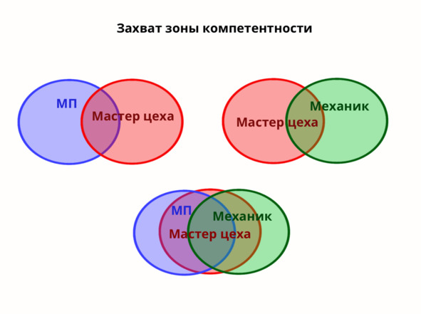 Таким образом, если представить всё это графически, как на рисунке №20, в виде областей, зон в виде овалов, то МП захватывает одну зону всех функций бригадира, а механик другую зону функций и компетенции бригадира.