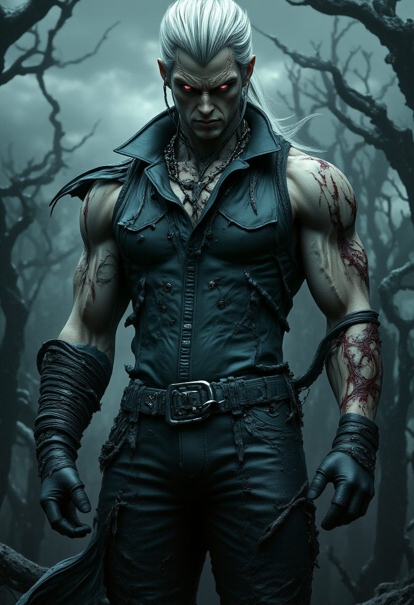 У него были длинные пепельно-белые волосы, стянутые сзади в низкий хвост. Некоторые, более короткие пряди, падали на лоб и виски. Широченная мускулистая грудь с порванной в некоторых местах кожаной безрукавкой. На ногах так же кожаные черные штаны, которые обтягивали его мощные длинные ноги. Обут он был в некое подобие военных берцев. Тот огромный меч, что так легко разрубает плоть, висит в ножнах на бедре.