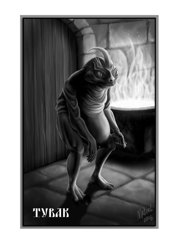 Подойдя к одной из них, он взял стекляшку, наполненную какой-то слизью красного цвета. Затем потянулся и снял с крюка кусок кожи, испачканный кровью. Проковыляв немного дальше, он достал с полки камень, из которого струилась чёрная дымка. Собрав свои дьявольские игрушки, Тувак разложил их на алтаре ровно по центру. Открыв банку с красной слизью, тот, её понюхав, скривился от невыносимой вони. Опустив туда свои корявые пальцы, он принялся писать какие-то знаки.