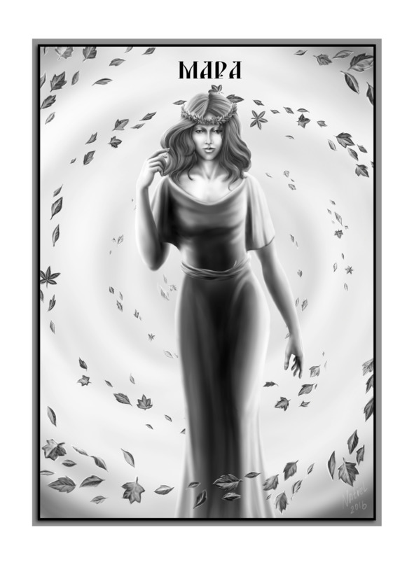 Стройная, как молодое деревцо, Мара была, несомненно, хороша! Её длинные рыжие волосы спадали на хрупкие плечи, а голову украшал венок из разноцветных листочков. На ней было одето ярко-зелёное платье, которое обвивал пояс, сплетённый из душистых трав. Лёгкой поступью она подошла к своему трону и, присев, аккуратно поправила платье. Взглянув на владык, Мара ласково улыбнулась и, кивнув, сказала: