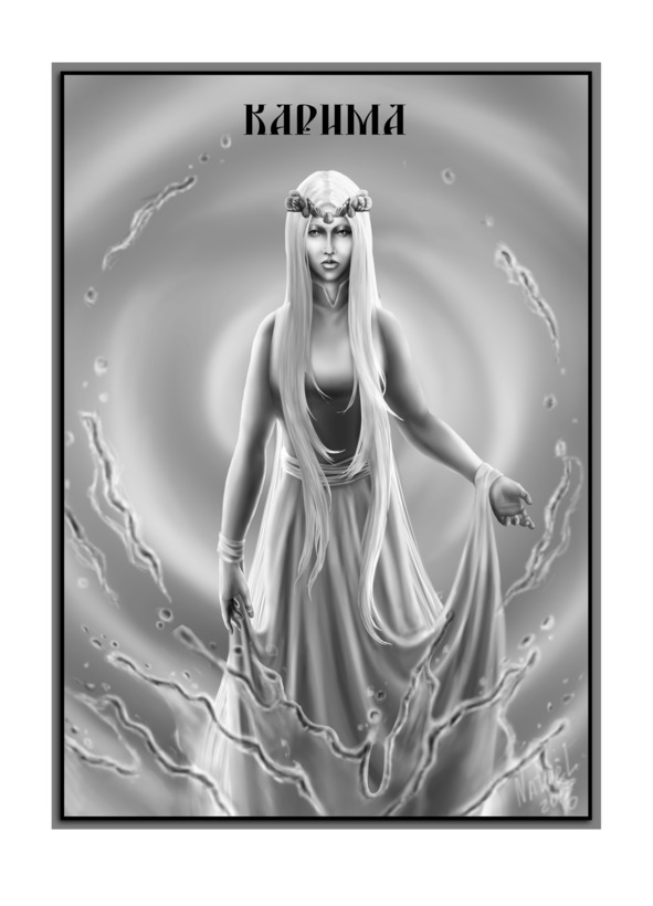 На пышном ковре из мягкой зелёной травы с неистовой силой забурлил источник. Его прозрачная вода взлетала вверх бурным фонтаном, и с каждой секундой он становился всё выше и выше. Вдруг водная завеса приоткрылась, и оттуда вышла хранительница морей и рек светлого мира. Её звали . Как только она покинула магический портал, водопад исчез, оставляя на густой траве мелкие капли росы. Карима