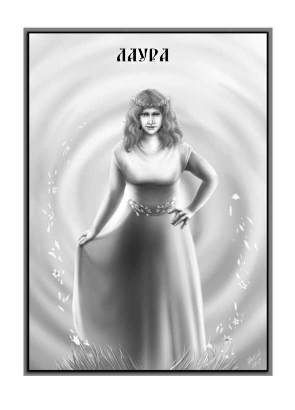Весёлая, озорная девушка небольшого роста. Нет, она не была стройной, как её сестры – хранительницы лесов и морей. Она больше походила на маленькую пухленькую «пышку». Озорные глаза Лауры так и сыпали весельем, радостью и беззаботностью. На ней было одето ярко-жёлтое платье, а на копне кучерявых золотых волос примостился плетёный венок, искусно свитый из пёстрых цветков. Он придавал этой очаровашке забавный вид. Кружась в смешном танце, Лаура подошла и, сделав реверанс великим правителям, сказала: