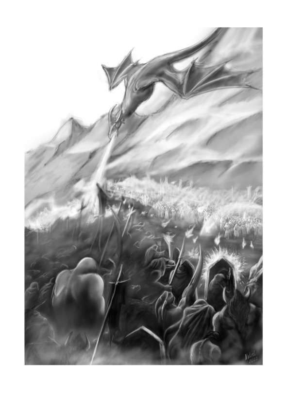 Монстры, услышав зов предводителя, все разом взмыли в небо. Словно чёрная туча, они понеслись вперёд, закрывая солнечный свет своими телами. А в это время Шабор яростно сражался на земле, окружённый со всех сторон свирепой нечистью. Вдруг он заметил, как по долине ползёт огромная тень. Тот украдкой взглянул вверх и, открыв пасть, выплюнул только что убитого зверюгу. Рядом с ним, тяжело дыша, бился дракон Тагнар, старый страж святых пещер. Шабор, не отрывая взгляда от летящих демонов, подскочил к нему и сказал: