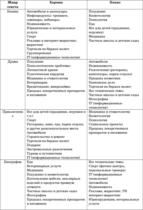 Такие тексты прекрасно подходят для продажи автомобилей, автомобильных аксессуаров, спортивных товаров. А вот писать тексты о похудении или психологических проблемах в стиле «Боевик» я бы не рекомендовала.