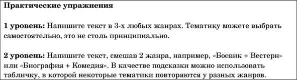 В некоторых случаях стили можно смешивать, создавая крутой продающий текст, рассчитанный на разную аудиторию. Отлично миксуются: боевик и комедия; биография и драма; комедия и вестерн. В написании смешанных текстов нужно использовать те же принципы, что и в одиночных случаях. То есть, если мы решили писать текст в стиле «Боевик + комедия» мы используем динамику боевика и добавляем юмор, не забывая про специальные слова.