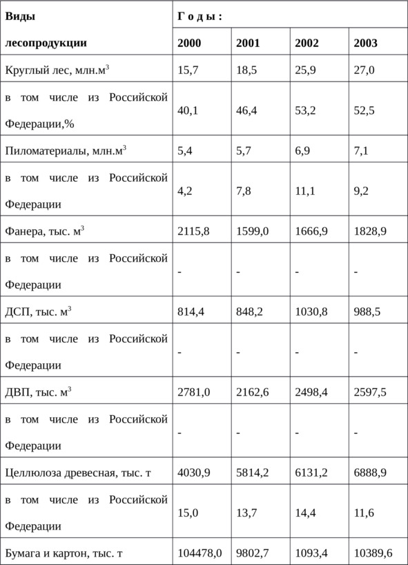 Что касается импорта лесобумажной продукции из РФ, то за анализируемый период с 2000 по 2003 г.г. постоянно росла доля в составе всей импортированной КНР лесопродукции по круглым лесоматериалов и пиломатериалам. При этом доля российских круглых лесоматериалов составила в экспорте в 2003 г. более 50%. Поставки листовых древесных материалов из РФ в КНР носили эпизодический характер и их доля оставалась ничтожно мала (менее 0,01%)