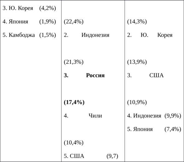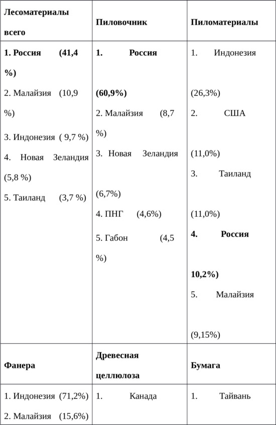 Наряду с РФ в поставках лесопродукции в КНР активно участвуют и другие страны, основные из которых приведены в в табл. 4,1