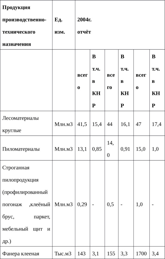 Среди отраслей промышленности лесопромышленный комплекс по выпуску промышленной продукции стабильно в течение ряда лет занимает 8-ое место, уступая электроэнергетике, нефтедобывающей промышленности, черной и цветной металлургии, химической и нефтехимической промышленности, машиностроению и металлообработке и пищевой промышленности. Доля лесопромышленного комплекса в структуре производства продукции по основным отраслям производства в период рыночных реформ имела устойчивую тенденцию к снижению. Так в 1992 г. она в ценах 1999 г. составила 5,9%, в 1995г. – 5,1%, в 2000г. – 4,8%, в 2003г. – 4,5%. Это связано с тем, что лесопромышленный комплекс в последние годы развивается по сравнению с основными отраслями промышленности более низкими темпами. Если в целом по Российской Федерации объем промышленного производства в 2004 г. составил 70% к уровню 1990 г., в электроэнергетике —77%, в топливной промышленности —92%, чёрной металлургии —83%, в химической и нефтехимической промышленности – 72%, в машиностроении и металлообработке – 69% и в пищевой промышленности – 70%, то в лесной, деревообрабатывающей и целлюлозно-бумажной промышленности – 49%.
