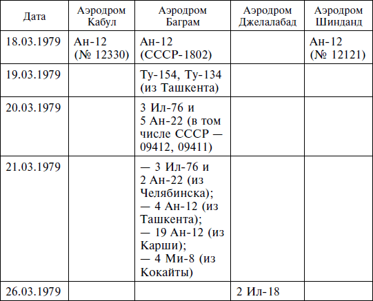 Общей статистики вылетов привести на данный момент не представляется возможным, приведу хронику полетов советской транспортной авиации на афганские аэродромы только нескольких дней марта 1979 г.:
