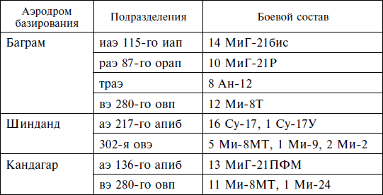 Советские авиачасти совместно с афганскими базировались на четырех аэродромах (Кабул, Баграм, Шинданд и Кандагар), еще на четырех аэродромах базировались раздельно советские (Кундуз, Файзабад и Джелалабад) и афганские (Мазари-Шариф) части.